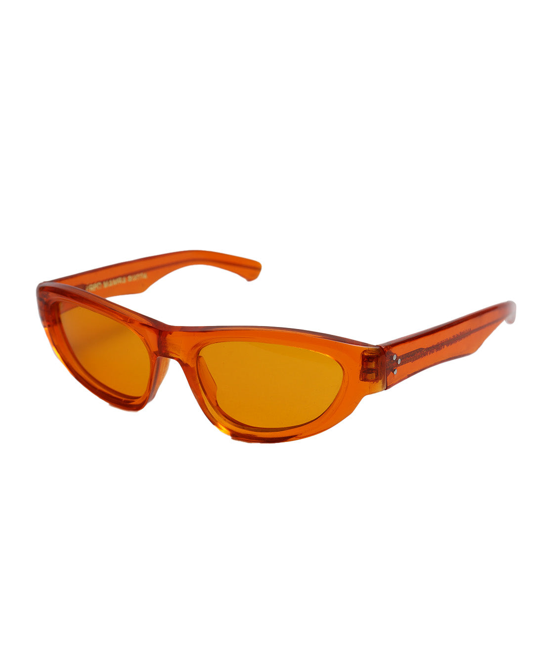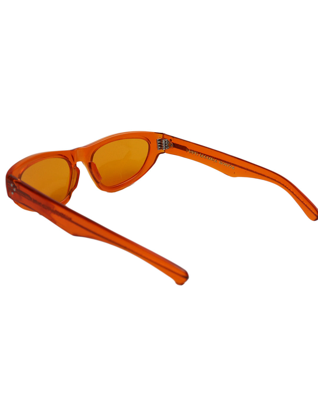 Montatura in acetato trasparente arancio, tagliata come una carrozzeria aerodinamica, con lenti tono su tono che restituiscono una visione calda, liquida, fuori dal tempo.